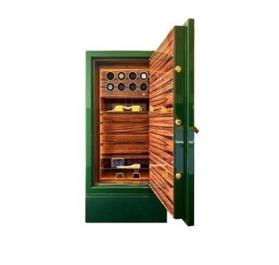 Emerald is a luxury safe in High Gloss Pearl Green, designed to complement warm, refined interiors. With Ebony Wood drawers, watch winders, and velvet-lined compartments, it offers secure, elegant care for your most treasured pieces.